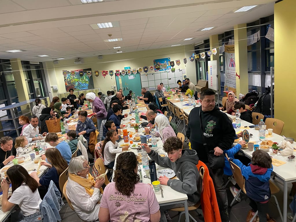 Auf dem oberen Schulhof lief Musik mit Liedern aus vielen Ländern. Das sorgte für eine fröhliche und entspannte Atmosphäre. In der Aula konnten Familien mit einem Pin zeigen, woher sie kommen – auf großen Karten von Deutschland, Europa und der Welt.